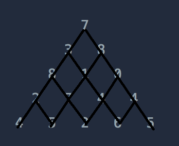 삼각형의 정보가 담긴 배열 triangle이 매개변수로 주어질 때, 거쳐간 숫자의 최댓값을 return 하도록 solution 함수를 완성하세요.