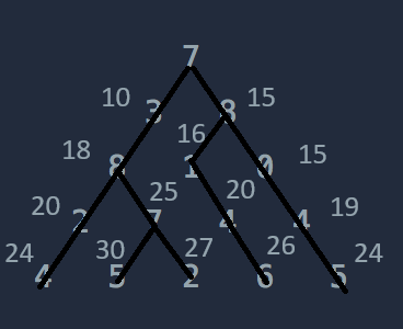 1을 기준으로 상위 요소의 값은 10과 15이며 이 중 값이 더 큰 15를 더하여 배열을 갱신한 후 이 과정을 반복한다.