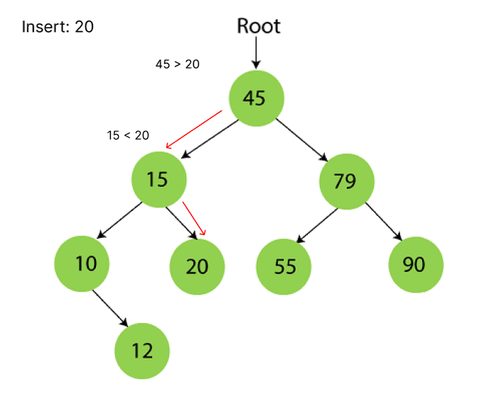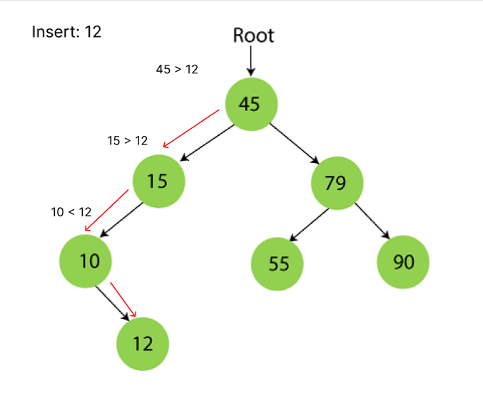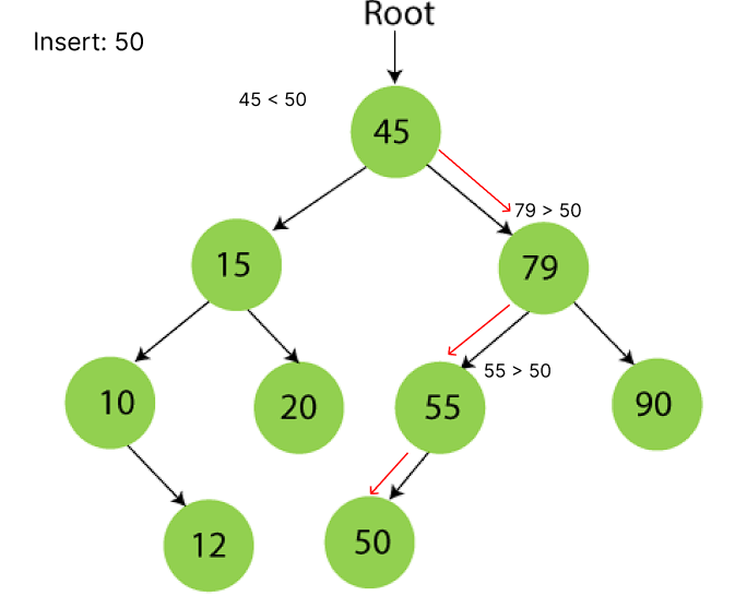 - 삽입할 값이 현재 노드보다 작으면 왼쪽 자식으로, 크면 오른쪽 자식으로 이동