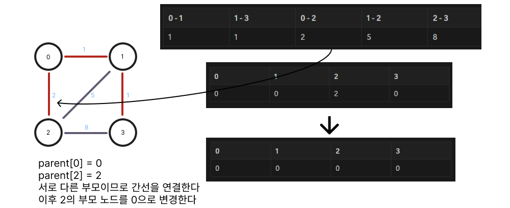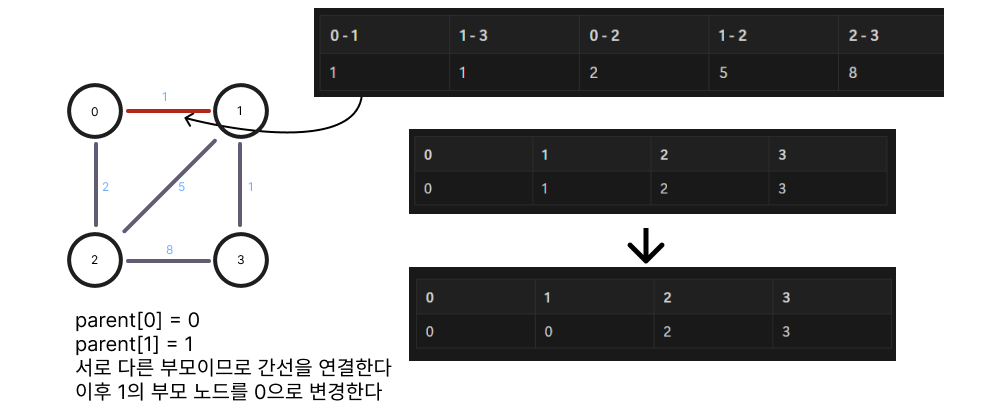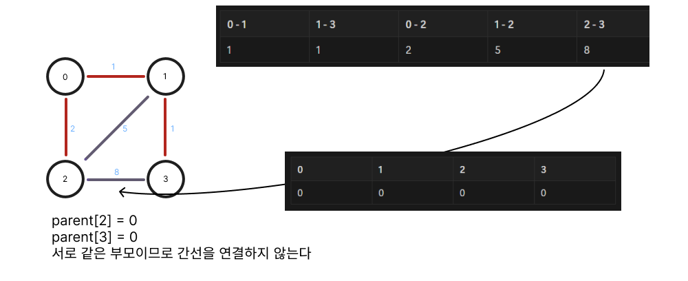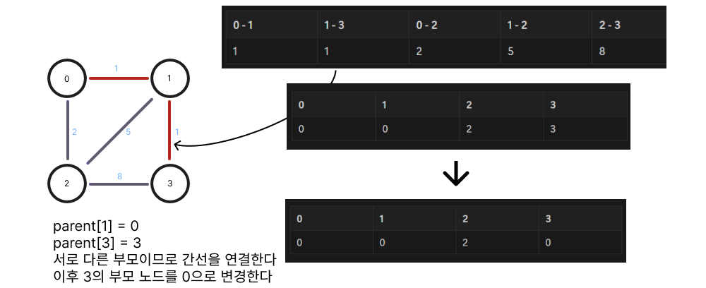 if(find(node1) != find(node2)){ // 부모 노드가 같지 않다면