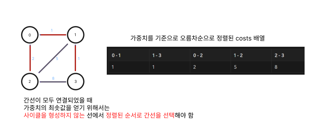 costs를 그림으로 표현하면 다음과 같으며, 이때 초록색 경로로 연결하는 것이 가장 적은 비용으로 모두를 통행할 수 있도록 만드는 방법입니다.