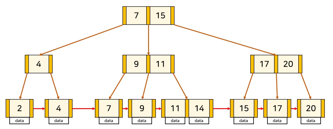 B+Tree의 리프 노드에는 실제 데이터 레코드를 찾아가기 위한 주솟값을 갖고 있으며, 리프 노드끼리는 연결리스트로 구성되어 있다